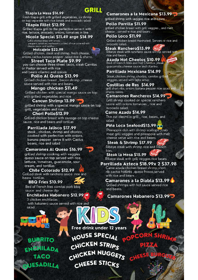 House Specialty. Carne Asada, chicken breast, hot links, shrimp, short ribs, cactus, queso fresco, onions and banana peppers served with rice and beans.