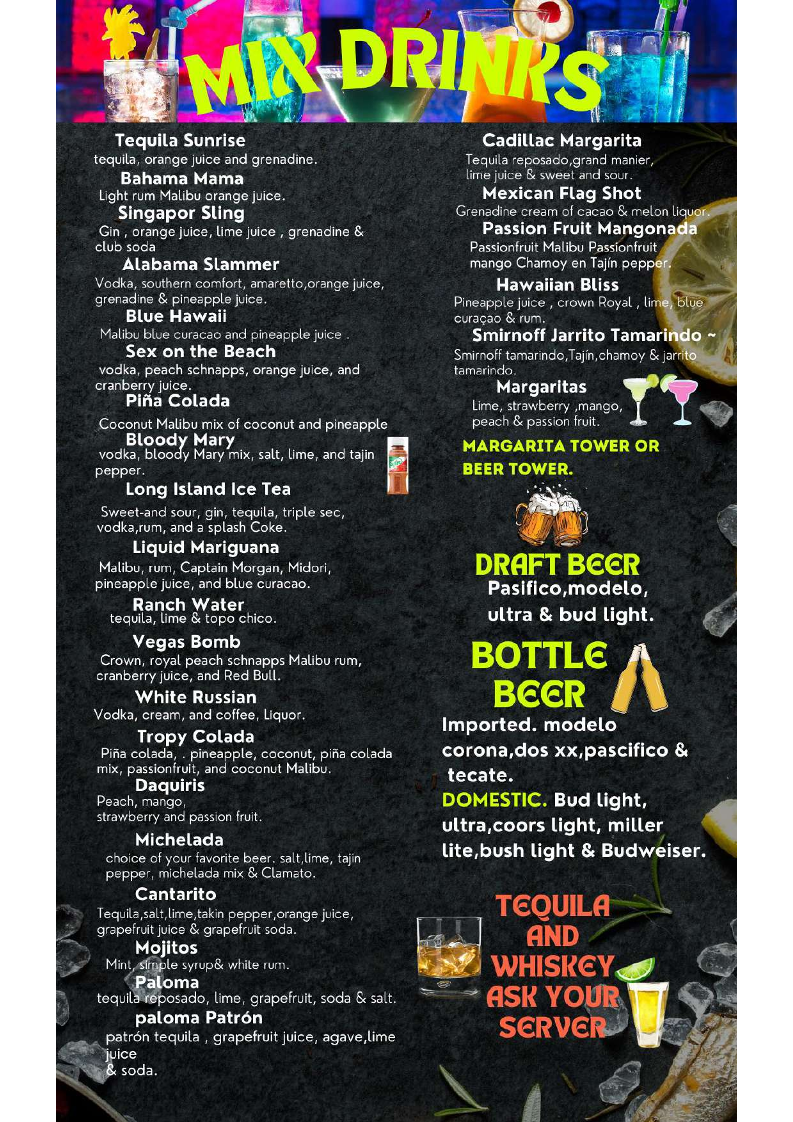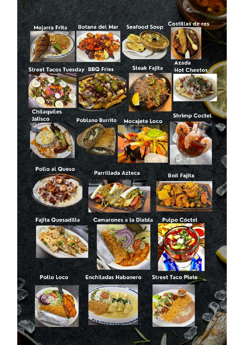 Scallops, shrimp, crab meat, tilapia, onions, peppers, tomatoes, with our special sauce, banana peppers, and queso fresco. Served with rice and avocado salad.