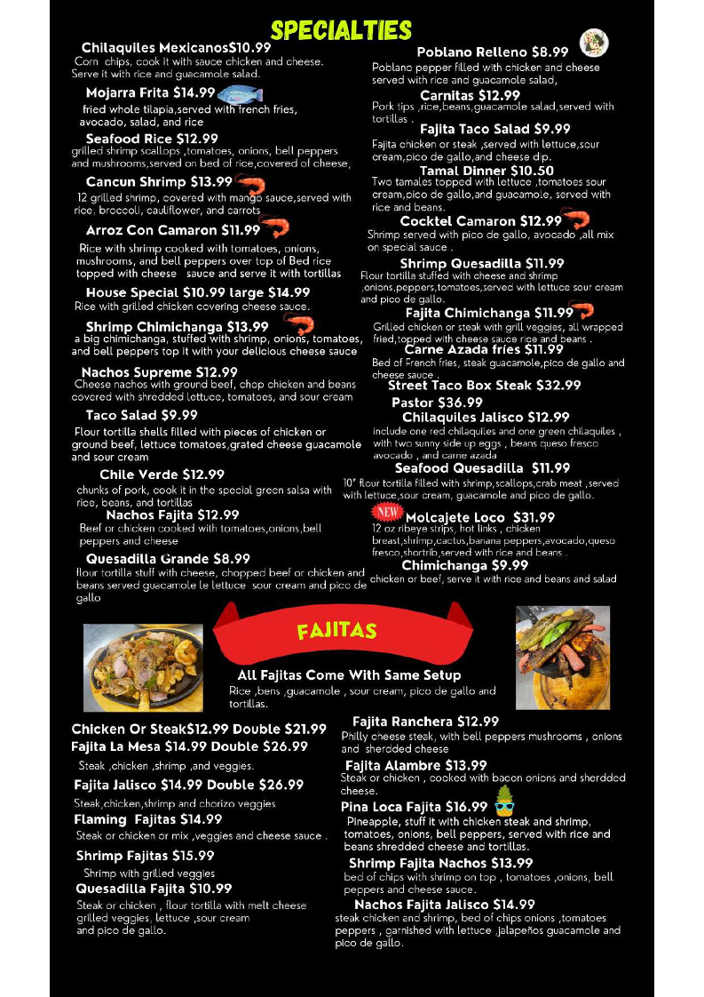Steak, chicken, shrimp and chorizo cooked to perfection with onions, jalapenos and cactus. Served with your choice of rice or salad.